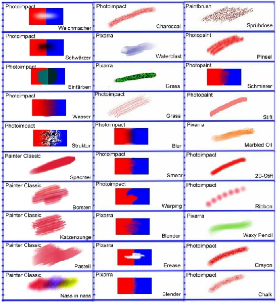 •  Corel-Photoimpact  x3 : (Früher Photoimpact 6 (bis Win XP)/ Das Foto-Mal-Programm hat sehr viele Werkzeuge, klares Menue.  Man kann damit, was kaum ein anderes Programm kann, nämlich schöne Bilderrahmen machen. Beste Möglichkeiten zur Dateienverarbeitung und zum Drucken. Sehr übersichtlich angeordnete Befehlszeilen. Bilderbrowser vorhanden ! Photoimpact kann mehrere Objekte gleichzeitig in einem Bild verarbeiten, man kann diese Objekte nach belieben verschieben und damit kreativ arbeiten. Man kann damit 20 Bilder gleichzeitig öffnen und bearbeiten. Das Programm eignet sich bestens zum Malen mit zwei Programmen. Sehr empfehlenswert bis Win XP. Arbeitet nicht mehr ganz korrekt auf Win 7/64