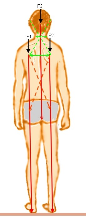 wird nicht ein einzelner Muskel gelängt, sondern der ganze Leib und damit eine Summe von Muskeln. Bei der Dehnung, taucht die Frage auf, in welche Richtung soll man dehnen. Betrachtet man in Bild1 die Kräfte F1, F2, und F3, die vom Körper zum Boden wirken, so erkennt man, das der Hauptkraftweg der Weg direkt von den Schultern über die Rippen, zwei kurzen Muskeln unterhalb der Rippen, den seitlichen Hüftknochen, und über die Oberschenkel, ist. Ein Teil der Schulterlast, fließt im schrägen Winkel über die Rippen in das gegenüberliegende Bein. Der dritte Kraftweg ist vom Kopf über das Rückgrad , über die Rippen und die Hüften gleichmäßig verteilt, durch beide Füße auf den Boden. Durch Stretching kann man der Verkürzung durch diese vier Belastungen entgegenwirken.