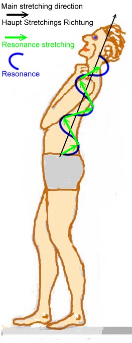 Falle kann die Resonanzdehung helfen. Dazu ziehen wir ein Körperteil in die Länge und wechseln rythmisch die Dehnungsrichtung und oder den Dehnungswinkel. Der optimale Rythmus liegt ebenfalls